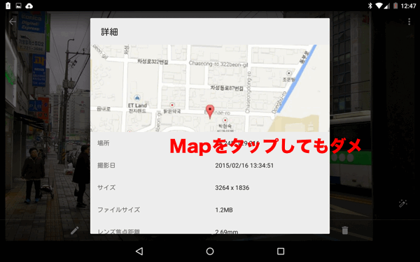 ところが、「フォト」の場合だと、詳細情報に表示される「Map」をタップしても「Google Map」は起動しません。