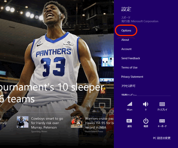 「MSNスポーツ」(トロフィーマーク)のアプリケーションを起動し、メニューを表示させ、設定を選択します。