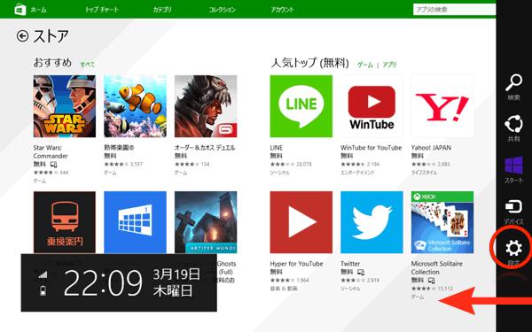 この状態で画面の右端から画面をスワイプし、メニューを表示させ、「設定」のギアマークをクリック/タップします。すると新たなメニューが表示されます。