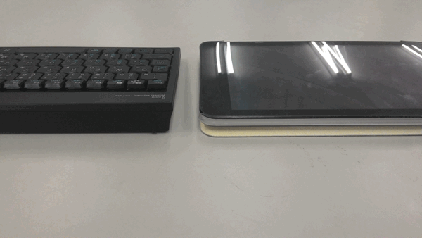 スペースキーのある手前側はタブレットの厚みと同じぐらいですが、ファンクションキーのある奥側はタブレットの2倍ぐらいの厚みです。(電池を入れないといけないので、この厚みはしょうがないのところです。)