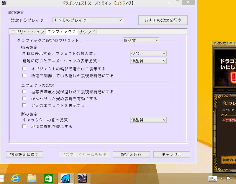 「グラフィックス」は全てチェック無し。低品質