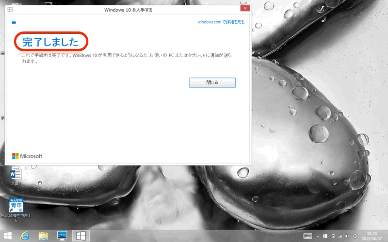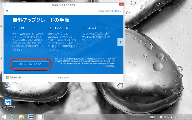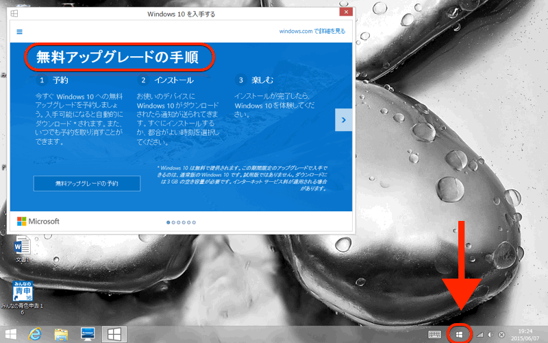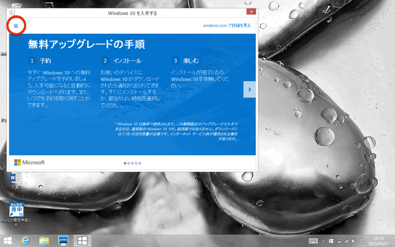 「Windowsマーク」をクリック/タップすると、「無料アップグレードの手順」というウインドウが表示されます。