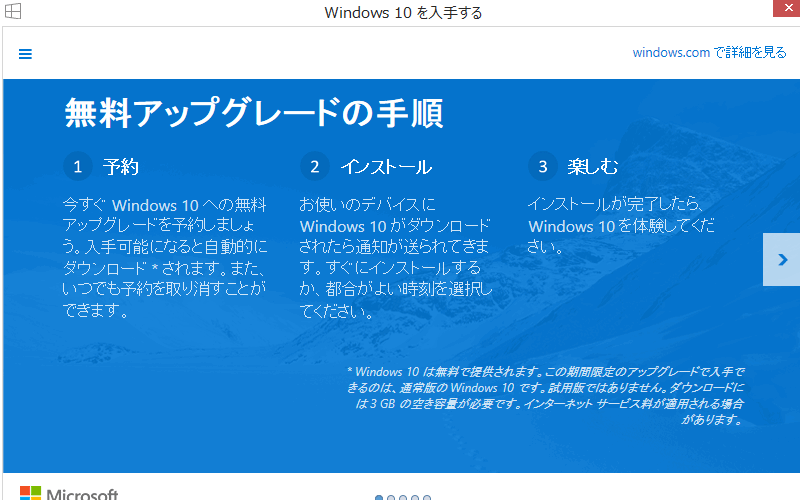 さて、「無料アップグレードの手順」が表示されれば、そこに表示されている「無料アップグレードの予約」をクリック/タップします。