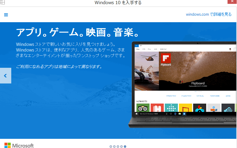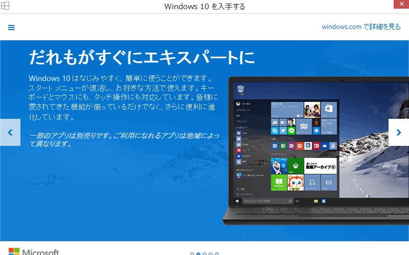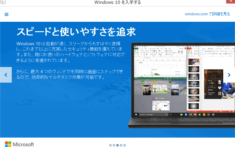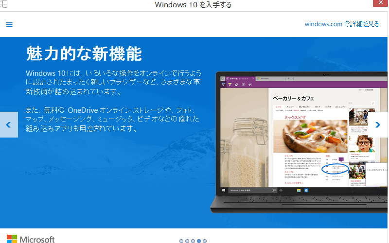 最期にアップグレードのウインドウに表示される「Windows 10」の情報をアップしておきます。